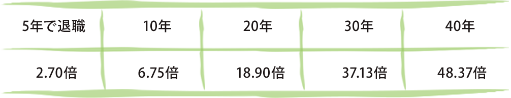 | 待 遇 | ・賞与/昨年実績 年2回 ・各種保険完備/雇用保険・労災保険・厚生年金・健康保険 ・車両通勤可/交通費支給 上限31,600円 ※距離によって変動 ・住宅手当/借家の場合 上限25,000円 ※家賃の1/2支給、世帯主であること 持家の場合5,000 円(本人名義) ・家族手当/新生児~中学生ひとりにつき5,000 円 高校生~22歳以下までの就学中の子供ひとりにつき10,000 円 ・入職祝い金(新卒に限り)/100,000円※試用期間終了後の賞与時※条件あり ・退職金共済加入(1年以上勤務) ※退職時の基本給×下記倍率 ![]() |