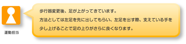 歩行は、日光浴を兼ねて、ベランダでされている。このまま、継続して行う。歩行器は、6月30日より、サドル付歩行器のサドルを外して、少し、高さを高めにして、実施している。少しだが、麻痺側の足が出る事がある。