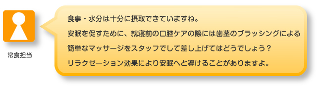 夜間(睡眠)少しずつではあるが、トイレのNSコール以外休まれている事が増えきている。活動では、行事に参加されたり、ユニットのフロアをモップかけされたりしているがまだまだ、夜間の安眠に繋がらない為、日中の活動を増やすようにしていく。