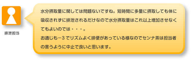 排泄は、外出などで、水分が取れない日以外以前はセンナを飲用されていたが、軟便が続く為中止し、1ヶ月経過しているが、センナ飲用せず、-3日位で、普通便が出るようになってきている。