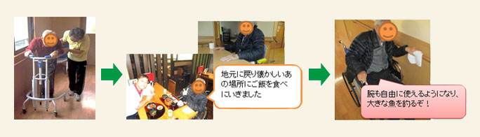 | 結果 | 身体機能について、起立動作は若干の機能向上見られ、以前より足が上がるようになったため、トイレ動作は多少改善された。また、それによって、外出先でのトイレを一名介助で実施することが出来ており、長時間の外出も可能とした。次なる夢目標に向かって日々のリハビリに意欲を持って頂いている。 |