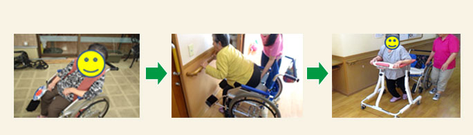 | 結果 | 退院時の早い時点より、立位訓練や家事活動など提供を始めた事によって、意識レベルが改善し、それに伴い歩行距離も長くなってきた。トイレ誘導も立位保持ができるようになられる |