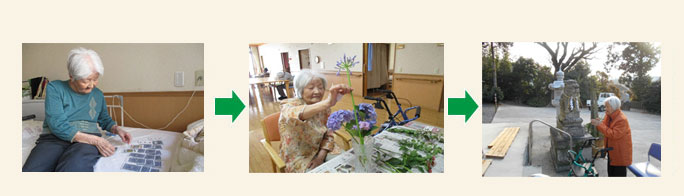 | 結果 | 入所当時は居室で過ごす事が多く、活動が少なかったが、生け花教室を始めた事により、他利用者との交流もでき、集団体操や施設行事にも意欲的に参加される様になった。生け花教室で完成した作品を1階~3階に飾り、毎日、水やり手入れに行かれる事で歩行距離も長くなってきた。 |