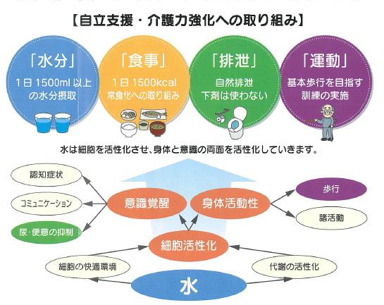 1日1500ml以上の水分摂取を行い、覚醒水準のアップを図る。覚醒水準がアップすれば必然的に活動性も向上。活動性も向上すれば起立大腸反射がおこり、空腹時に水分摂取を促すことで胃・大腸反射がおこり、大腸の動きが活発になる。