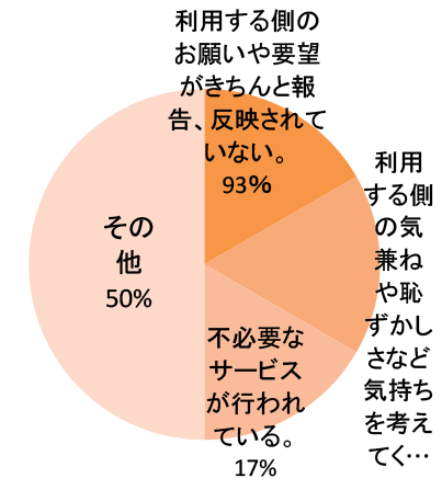 | ・ご家族様方は家人を専門職が沢山いる施設へ預ける事で安心されていると思います。 | ・通所送迎時、歩行器が自宅玄関入り口に置いてある。家族帰宅時、入り口にあるから邪魔になる。 |