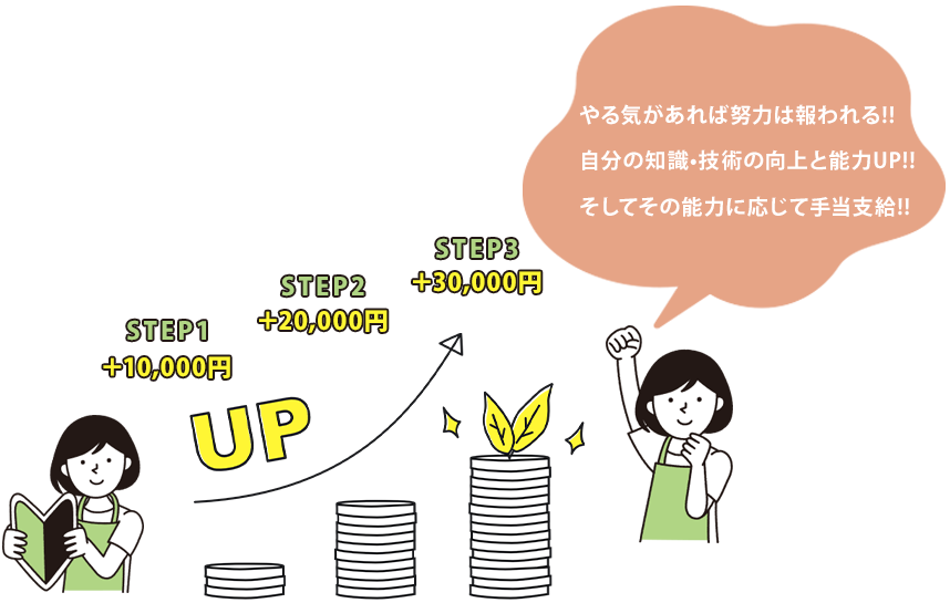 | キャリアパス手当 | 一般職員 ステップ1 10,000円/月 ステップ2 20,000円/月 ステップ3 30,000円/月 役員職員 リーダー 15,000円+各ステップ/月 主任補佐・フロアリーダー 25,000円+各ステップ/月 主任 35,000円+各ステップ/月 ![]() ※ケアeトレーナーシステムにて各ステップを合格することで支給される |